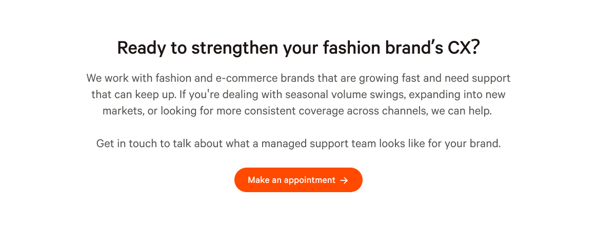 And when support teams are managed without clear structure or agency oversight, quality drifts. Agents fall back on scripts, de-escalation suffers, and CX managers end up micromanaging instead of building systems. That's a common situation for fast-growing fashion brands that scaled their teams quickly but didn't have the infrastructure to match.