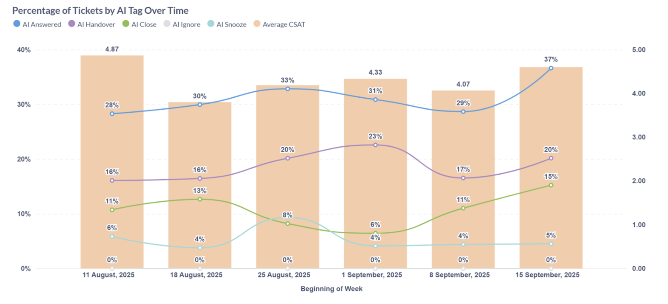 AI Answered: The percentage of tickets where the AI sent a response shows a steady increase, rising from 28% to 37% (+32%). This confirms that the AI is being deployed to engage with a progressively larger share of customer interactions, rather than immediately routing them to human agents.